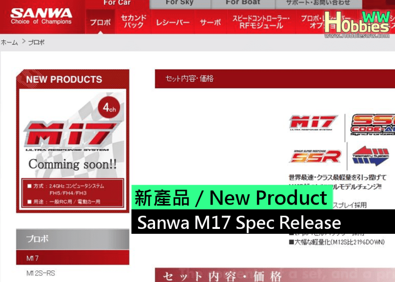 現時非常流行的三禾Sanwa M12S遙控器終於推出後繼型號, 名為Sanwa M17, 最近公布了產品規格, 預算會在2018年5月份的靜岡模型展公開實物, 以下為現時公布Sanwa M17的產品規格!