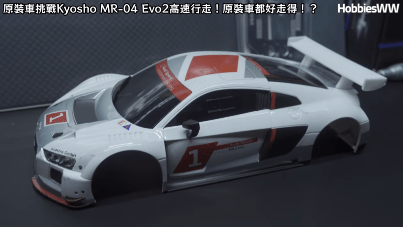 這就是原裝Kyosho MR-04 Evo2狀況,基本上沒有換過改裝件,用開盒跟車零件,但由於車呔不包,可自由選擇流行的車呔,以及Audi R8車殼,做出片段裡MR-04行走情況